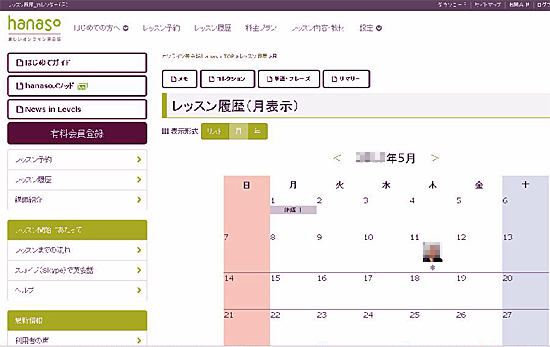 会員ページはシンプルで見やすく、使い勝手は良いです。 レッスン履歴を見る時も、カレンダーに講師の写真付きで表示されるのでレッスン日の確認も容易です。もし、複数の講師にレッスンを受けている場合でも、いつ誰のレッスンを受けたのかが一目瞭然なので、とても便利だと思います。